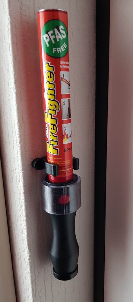 SPITA FireFighter attached at the wall next to door with the special clamp.
